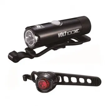 Prisvärt uppladdningsbart lampset som består av framlampan CatEye Volt 100XC [HL-EL051RC] och baklampan CatEye Orb Rechargeable [SL-LD160RC-R].