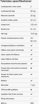 - Den höga lastkapaciteten (2 × 30 kg) möjliggör även transport av elcyklar och Pedelec-cyklar.