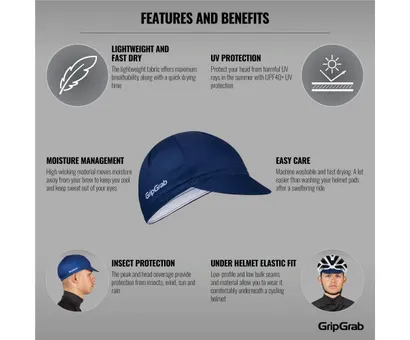 Ställ en fråga om GripGrab Lightweight Sommarcykelkeps NavyCykelkepsen GripGrab Lightweight Summer Cycling Cap förhindra effektivt att svetten rinner ner i ögonen och skyddar dessutom ditt huvud från skadliga UV-strålar. Modell med klassisk design i moderna, mycket funktionella och extremt lätta material med utmärkt ventilationsförmåga.