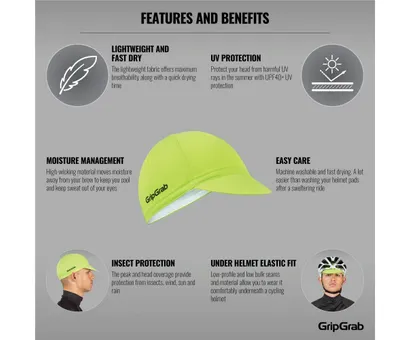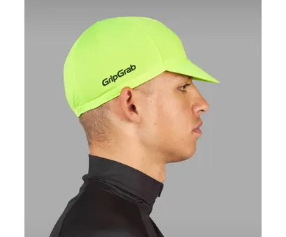 Ställ en fråga om GripGrab Lightweight Sommarcykelkeps Yellow Hi-VisCykelkepsen GripGrab Lightweight Summer Cycling Cap förhindra effektivt att svetten rinner ner i ögonen och skyddar dessutom ditt huvud från skadliga UV-strålar. Modell med klassisk design i moderna, mycket funktionella och extremt lätta material med utmärkt ventilationsförmåga.
