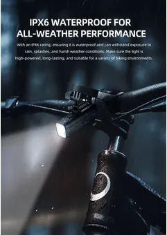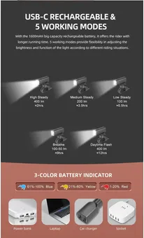 Laddning sker med den medföljande USB C-kabeln, du laddar den fullt på runt 1,5 timmar ochden levererar brinntider på mellan 2 timmar i högläge till 12 timmar i blinkande läge. Batteriindikatorn varnar i god tid när du behöver ladda med blått sken (61-100%), gult sken (21-60%) och rött sken (1-20%). Du fäster den enkelt utan verktyg på styret, och snabbfästet gör det smidigt att ta i och ur lampan vid snabba stopp, kan fästas både ovan och under styret.
