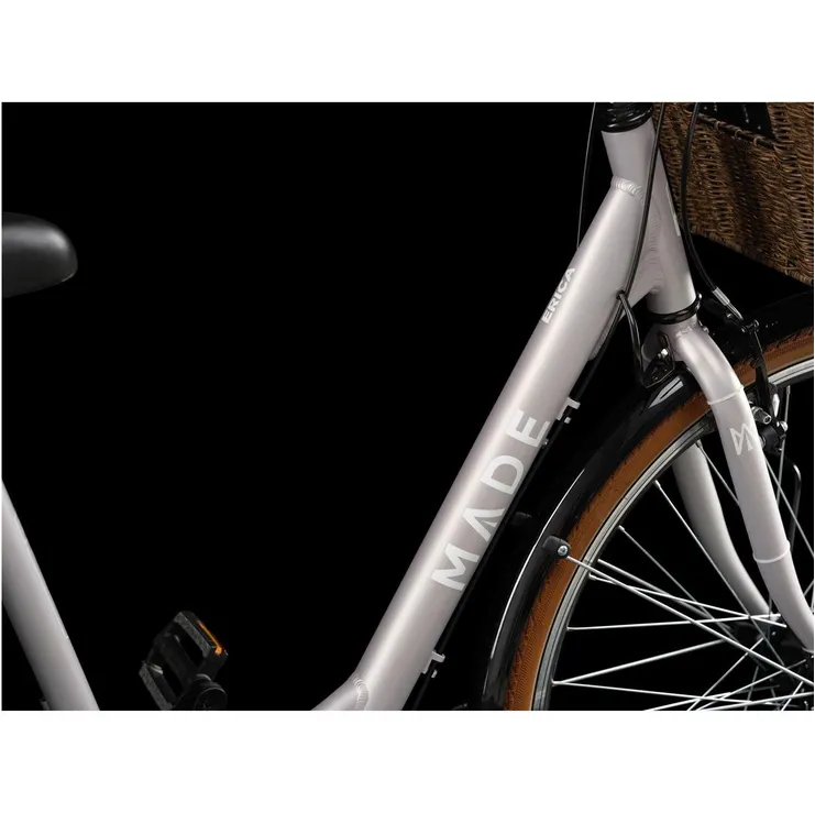 Den vackert välskapta och eleganta Made Erica är en damcykel med bred repertoar och solida komponenter som skapar en trygg känsla av pålitlig driftsäkerhet. Det här är en underbart komfortabel och välutrustad cykel som tar dig dit du vill, och den gör dessutom med stil. Det har ingen som helst betydelse om du kör asfalt, kullersten, slingriga grusvägar eller avkopplande söndagsrundor i gott sällskap för den tar sig fram på de flesta typer av underlag. Och det spelar heller ingen roll om det handlar om daglig jobbpendling, långa upptäcksfärder eller bara en avslappnad söndagstur... för den ställer alltid upp!