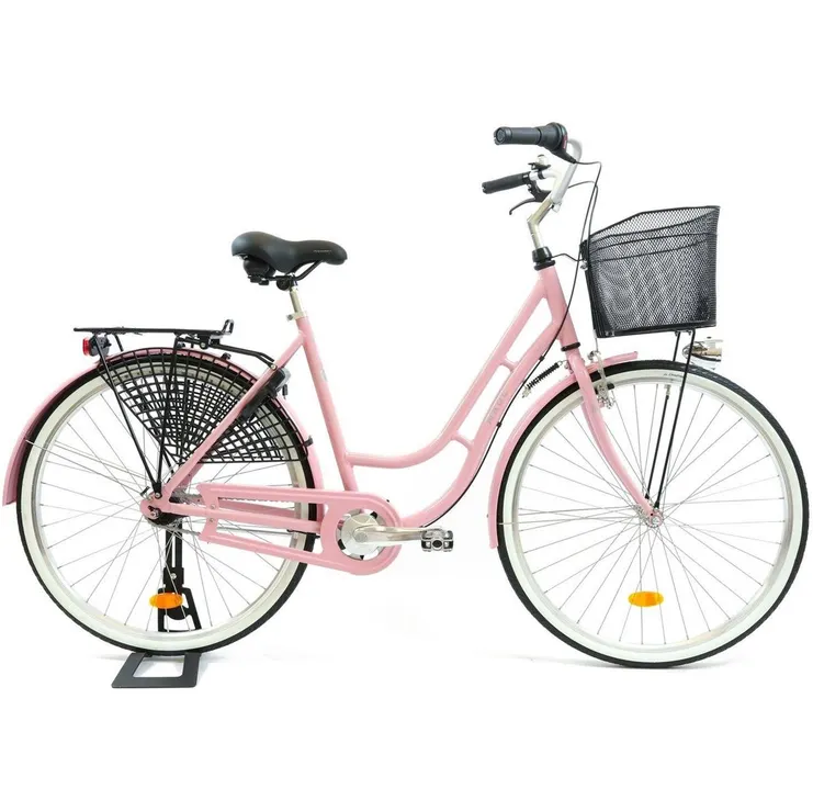- Framgaffel Citystålgaffel med fäste för skärm, cykelkorg och v-broms. En smart fjäder sitter fäst mellan gaffeln och ramen som ser till att hjulet pekar rakt fram när cykeln är parkerad, underlättar när man ska lasta i korgen