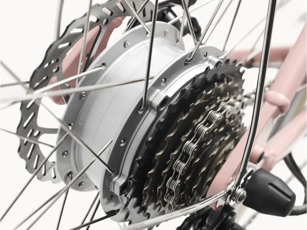 Med elmotorn i baknavet uppnås visserligen inte riktigt samma dynamisk känsla som med en mittmotor, men funktionen är precis lika pålitlig och kedjan behöver dessutom bara ta hand om kraften från cyklisten vilket gör att den inte slits lika snabbt. Den driftsäkra navmotorn är dessutom följsam och svarar snabbt utan att upplevas som ryckig eller ojämn i gången. Motorn samarbetar fint med de 7 utanpåliggande växlarna från kvalitetssäkra Shimano och partnerskapet sker både smärtfritt och effektivt. Den totala körsträckan på en laddning beror på en rad faktorer (som t ex vägförhållanden, assistansläge, passagerarvikt, lufttryck etc) men cykeln ger en räckvidd på upp till 65km, vilket nog räcker gott åt de allra flesta.