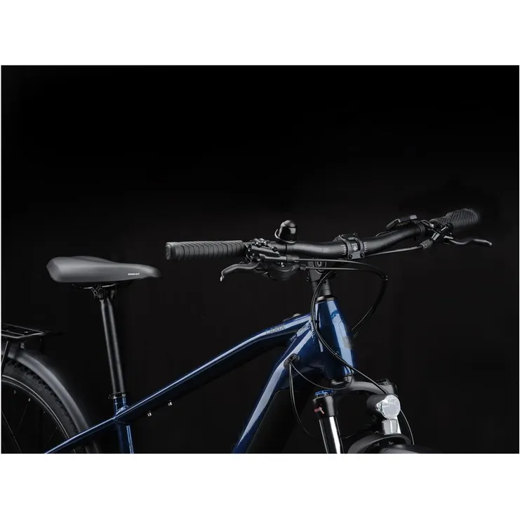 Den stabila ramen i aluminium utgör en solid grund och har vinklar som levererar en komfortabel position i sadeln med tydlig uppsikt över dina medtrafikanter. Framtill hittar du dessutom en dämpad framgaffel som ger dig ökad komfort och möjligheten att kunna åka lika fort på stökiga skogsstigar som på slingrande cykelbanor. Tack vare dess justerbara styrstam så kan du enkelt reglera körställningen, en underskattad funktion som ger dig ökade valmöjligheter.