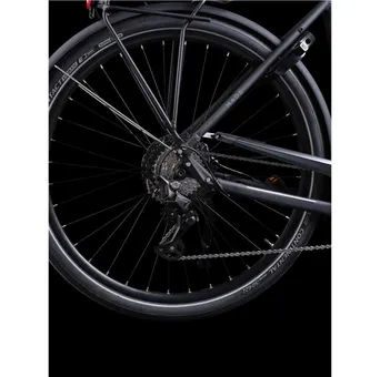 Det robsuta chassit består av en stomme i aluminium med extra lågt insteg och en geometri som ger dig en position med full uppsikt på allt som händer runt omkring dig i trafiken. Framtill hittar du dessutom en dämpad framgaffel med 63 mm slaglängd och lockout, vilket ger dig ökad komfort och möjligheten att kunna åka precis lika fort på stökiga skogsstigar som på slingrande cykelbanor.