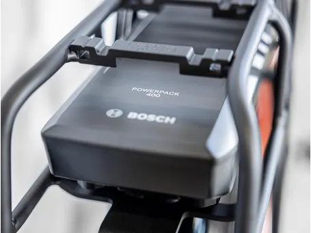 - Högklassigt batteri från Bosch (Powerpack 400Wh) som är smart placerat på cykelns MIK-pakethållare