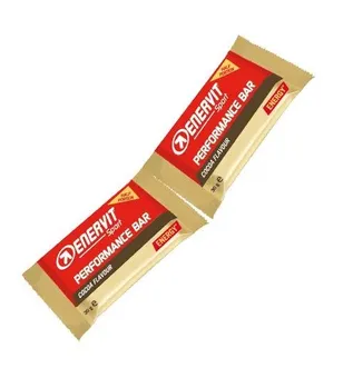 Enervit Sport Performance Bar Cocoa är en välsmakande energibar som är användbar vid intensiv muskulär ansträngning. Dessa två halva portioner (totalt 60 gram) utgör en källa till B1- och B6 vitaminer som bidrar till normal energiomsättning. Vitamin B6 bidrar till att minska trötthet och utmattning.