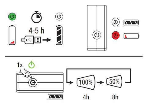 | Brinntid | Ljusläge 100%: 4h - Ljusläge 50%: 8h |