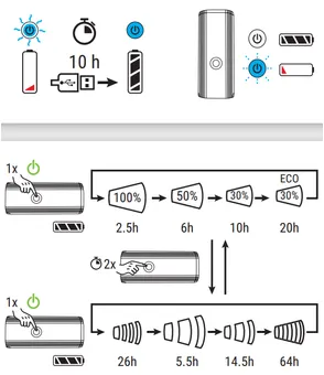 - Brinntid: 2.5 - 64 timmar (beroende på ljusläge)