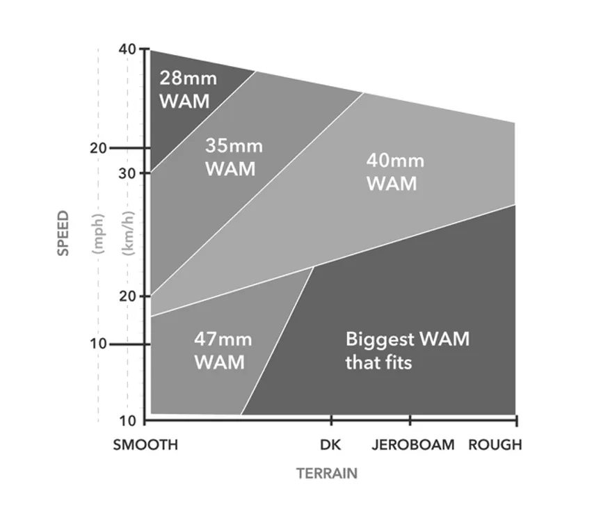I praktiken handlar de mycket kort förklarat om en utformning som medger att du kan köra med flera olika hjulset för att täcka in ett ännu mer omfattande register med en rad olika däcksbredder. Vill du fokusera på ren hastighet så väljer du ett hjul (700c) med VAM på 35-42 mm. Men om du istället vill fokusera lite mer på ren framkomlighet så väljer du ett lite robustare och bredare hjul (650b), och det fina i kråksången är att 90% av ramens aerodynamik bibehålls med WAM på upp till 61mm breda däck.