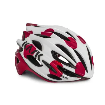 Ställ en fråga om Cykelhjälm Kask Mojito vit/röda prickarDen lätta och kompakta Kask Mojito är en vass landsvägscykelhjälm med riktigt bra ventilation och vass prestanda som används av Team Sky. Hjälmen har Kasks up‘n’down justeringssystem som ger den mest exakta och bekväma passformen av alla hjälmar tack vare sin unika dubbelsvängda design. Det gör att bakhuvudet omfamnas av remmar som sedan lätt kan dras åt till rätt spänning genom ett centralt spärrhjul. Tillsammans med det halkfria, gelvadderade fodret med väldigt god andningsförmåga garanteras bästa möjliga komfort. Hjälmen har 26 lufthål som håller dig sval och torr när du cyklar och hakspännet är vadderat med ett bekvämt eco-läder som är antiallergiskt och tvättbart. Den inre vadderingen i hjälmen är bearbetat med en antibakteriell- och antimikrobiellbehandling och den kan tas av och tvättas.
