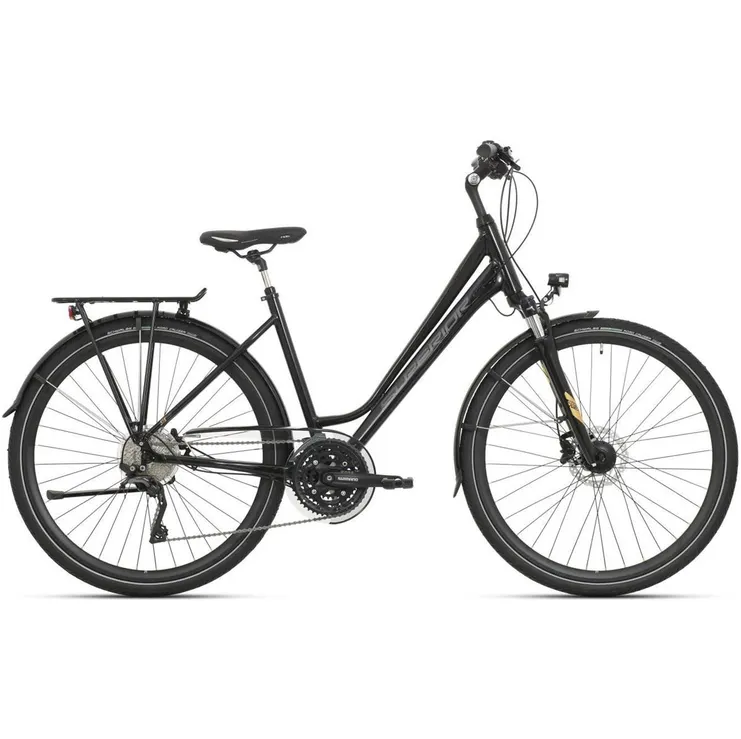 Ett smart transportmedel som både människa och miljö mår bra av och som är skapat kring en lätt aluminiumram med interna kabeldragning samt ett praktiskt lågt insteg som ser till att du alltid hittar en bekväm körställning och som ger dig riktigt bra uppsikt på vad som händer i trafiken. Cykelns dämpade framgaffel kommer från kvalitetssäkra Suntour (NEX-HLO), vilket ger dig extra komfort på sträckningar där underlaget är stökigare.