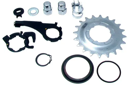 Innehåller: Axelmutter x 2 , Bromsarmsklämma, växelklocka och drev. (För vajer utan gummitätning). Obs! Detta är till första generationen med låsring i metall för klockan.