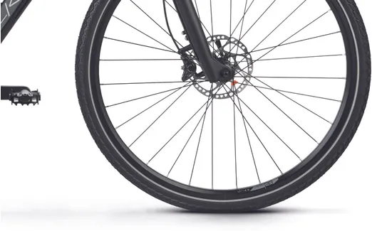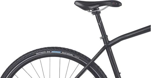 En dämpade framgaffel från Rock Shox (Paragon Gold RL) med 65 mm slaglängd och remote lockout (du enkelt kan låsa dämparen via reglage på styret) kombinerat med robusta hjul med lite bredare kvalitetsdäck (42 mm) ser till att du tar dig fram med full bekvämlighet även där underlaget sett sina bästa dagar, vilket bidrar till en komfortablare upplevelse i sadeln. Cykeln är dessutom redan från start förberedd med fästpunkter för både skärmar och pakethållare, vilket ju kan vara praktiska kompisar i vårt skandinaviska klimat med både ur och skur.