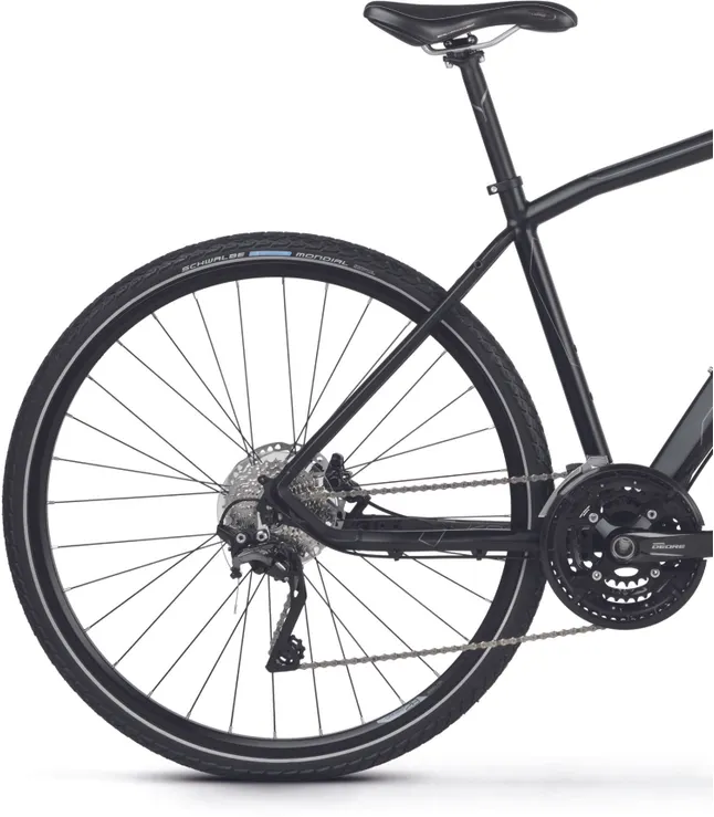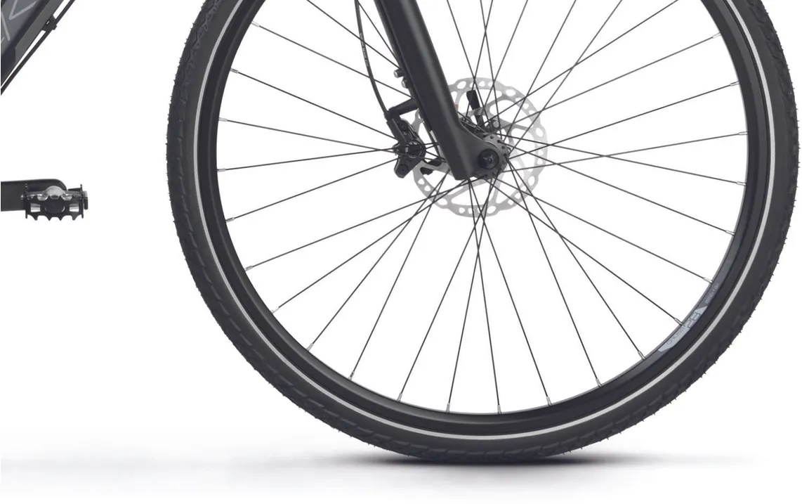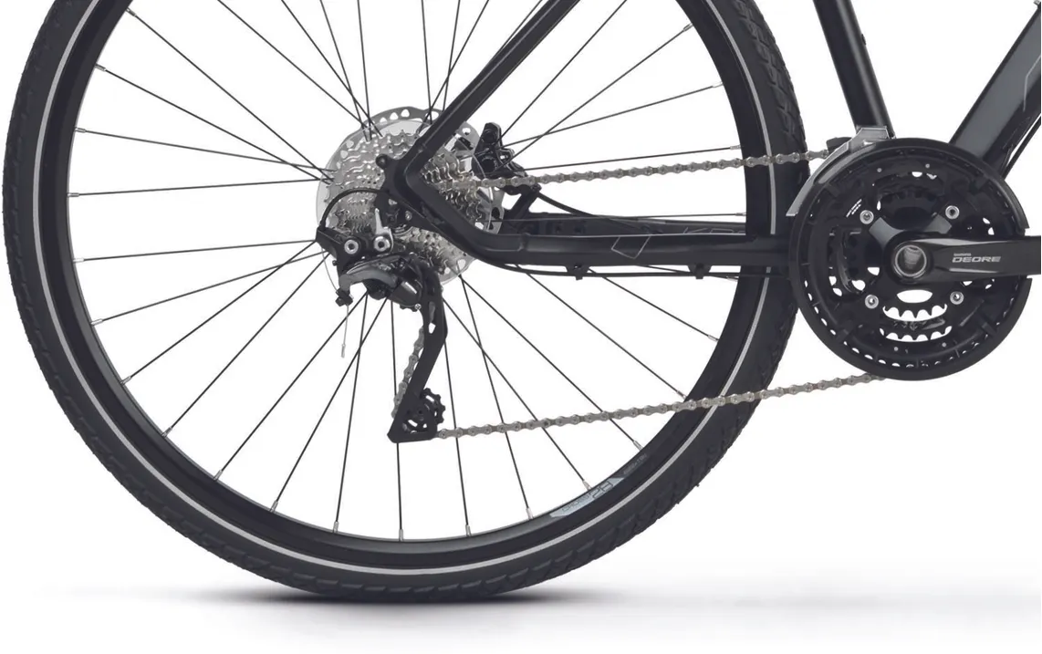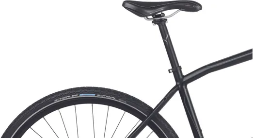 En dämpade framgaffel från Rock Shox (Paragon Gold RL) med 65 mm slaglängd och remote lockout (du enkelt kan låsa dämparen via reglage på styret) kombinerat med robusta hjul med lite bredare kvalitetsdäck (42 mm) ser till att du tar dig fram med full bekvämlighet även där underlaget sett sina bästa dagar, vilket bidrar till en komfortablare upplevelse i sadeln. Cykeln är dessutom redan från start förberedd med fästpunkter för både skärmar och pakethållare, vilket ju kan vara praktiska kompisar i vårt skandinaviska klimat med både ur och skur.