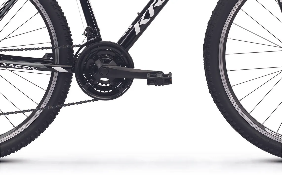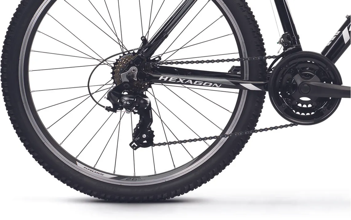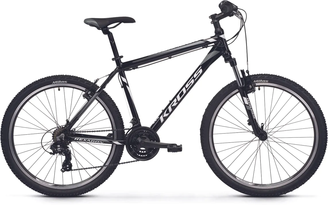 Ställ en fråga om Kross Hexagon 26" svart/vit/grafitgråPopulära Kross Hexagon 26" är en prisvärd mountainbike med massor av cykelglädje som är skapad för lättare turer i skogen, på stigarna och på grusvägarna. Visst, den har enklare utrustning än sina större syskon i serien men den har funktionella komponenter och den passar dig som kör kortare sträckor och som kanske inte alls planerar att köra hårt.