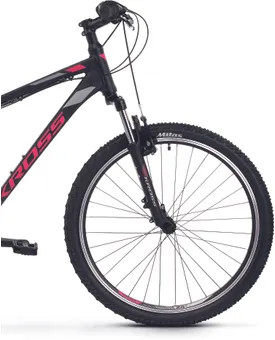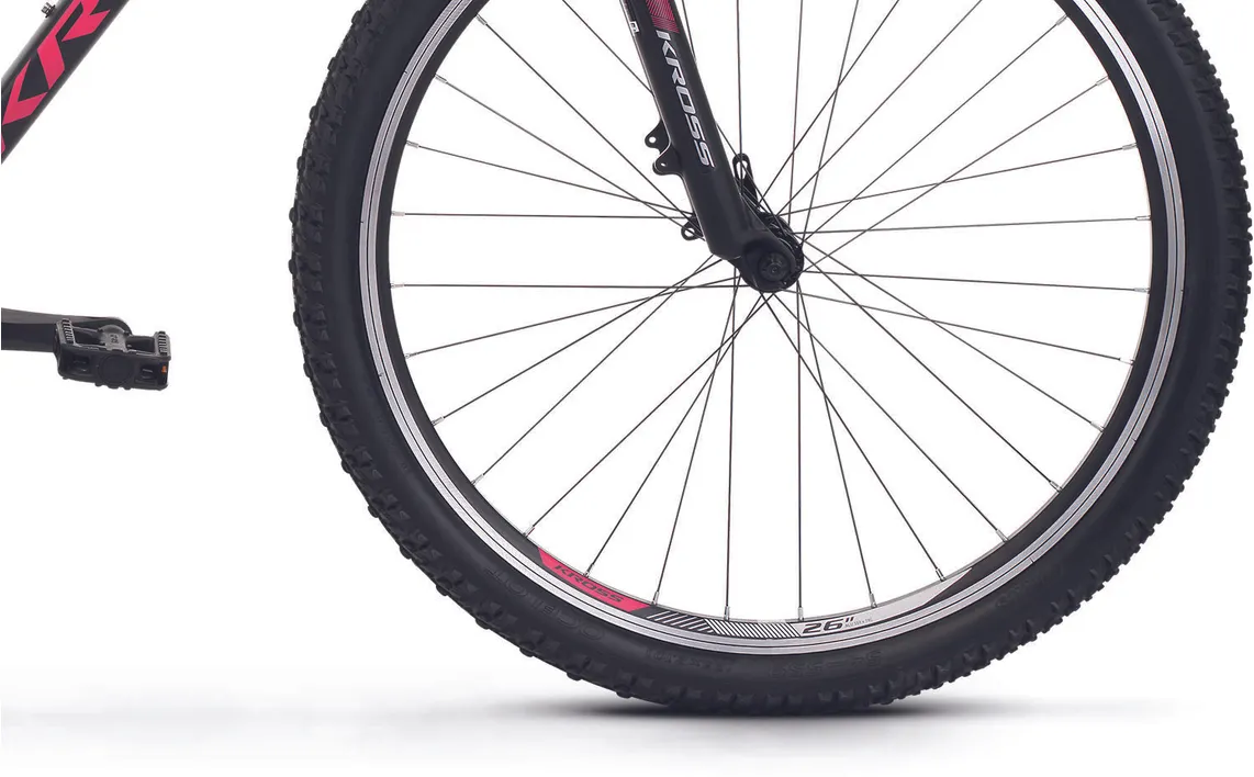 En dämpade framgaffel från Kross med 80 mm slaglängd kombineras med stabila 26"-hjul som ser till att du tar dig fram med hög bekvämlighet och bra grepp, vilket bidrar till en roligare upplevelse i sadeln när underlaget är lite sämre. Inbromsningarna sker med hjälp av traditionella v-bromsar, de är både lätt att underhålla och ser till att du slipper släpa på onödigt vikt.