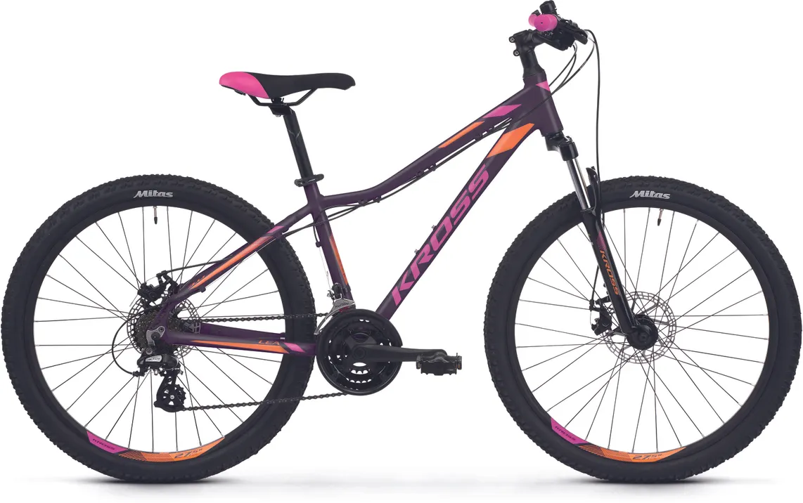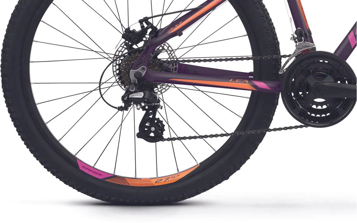 Ställ en fråga om Kross Lea 3.0 27.5" matt violett/rosa/orangeMångsidiga och prisvärda Kross Lea 3.0 27,5" är en mountainbike med högvis av cykelglädje som är skapad för lättare turer i skogen, på stigarna och på grusvägarna. Visst, den har enklare utrustning än sina större syskon i serien men den har funktionella komponenter och den passar dig som kör kortare sträckor och som kanske inte alls planerar att köra hårt.