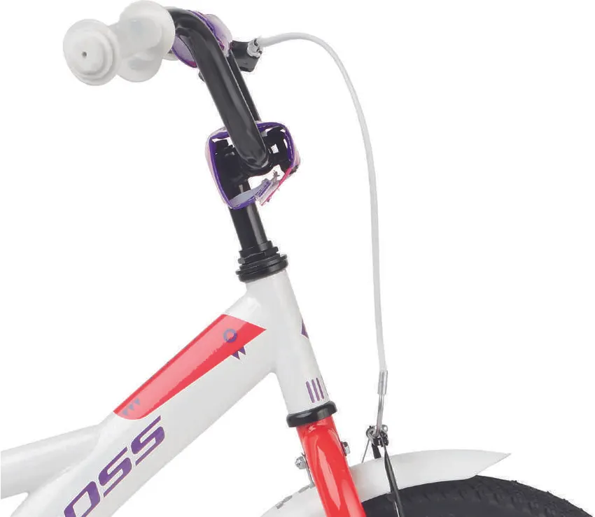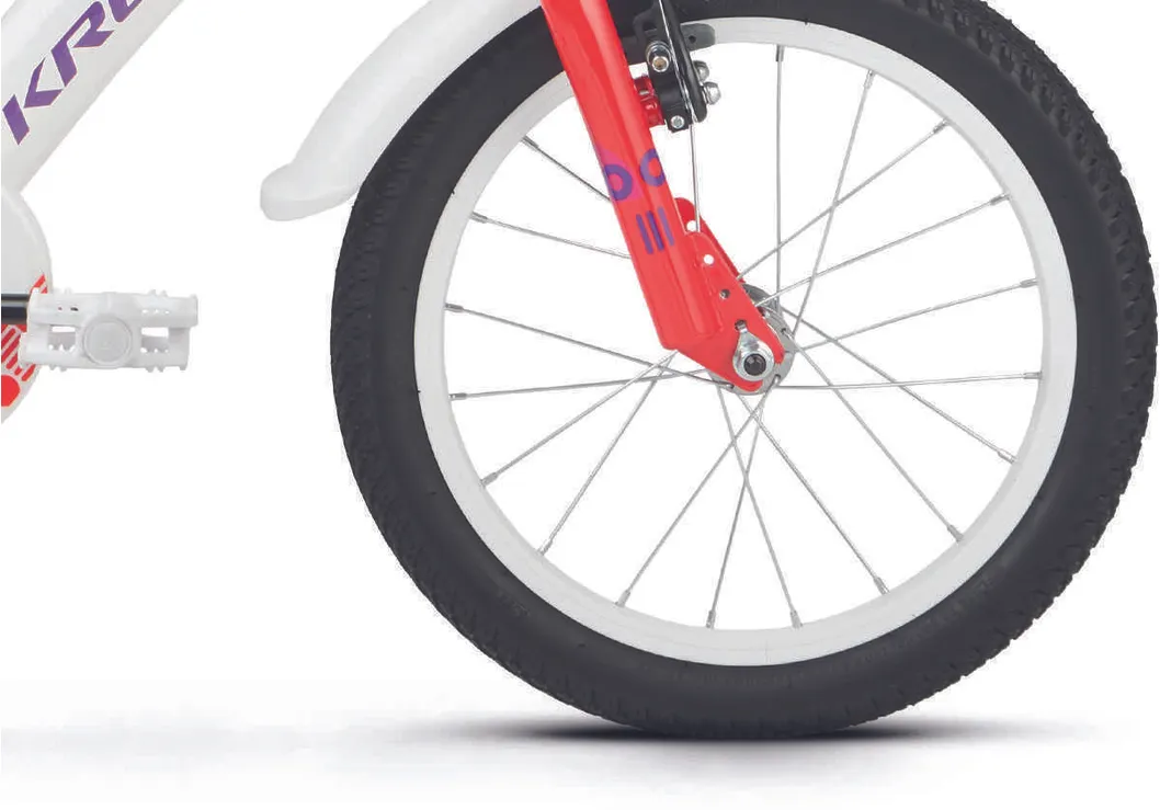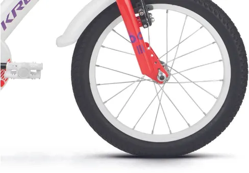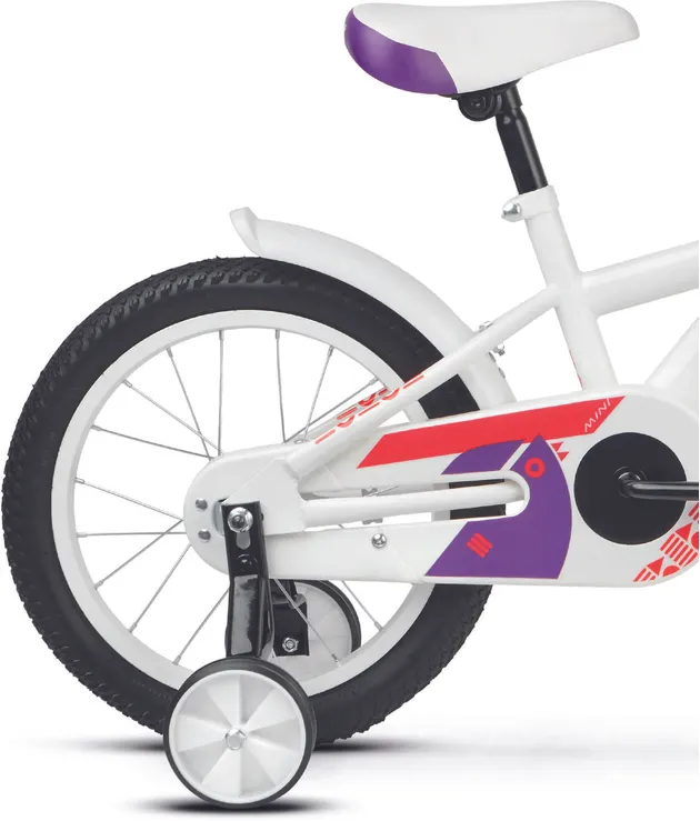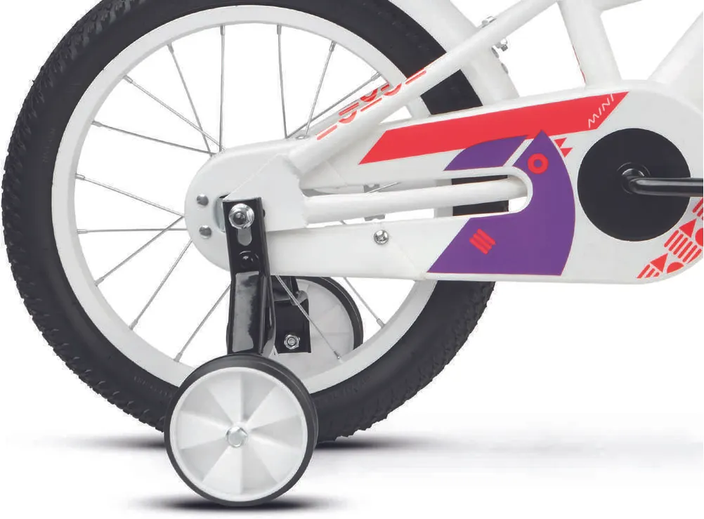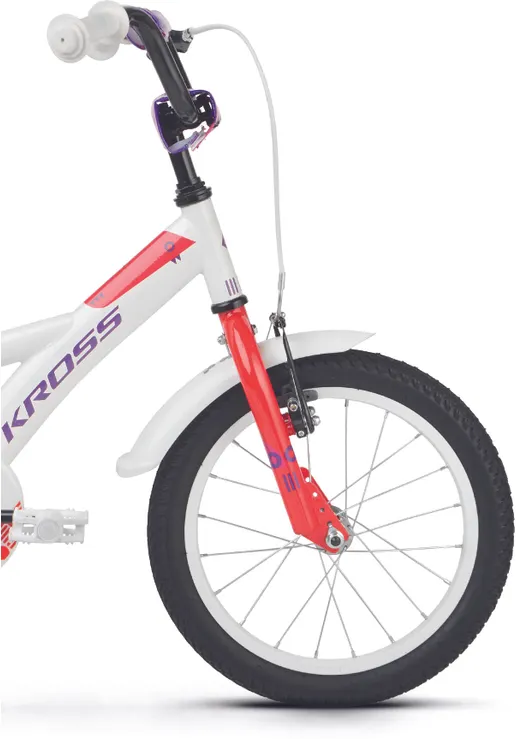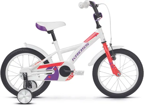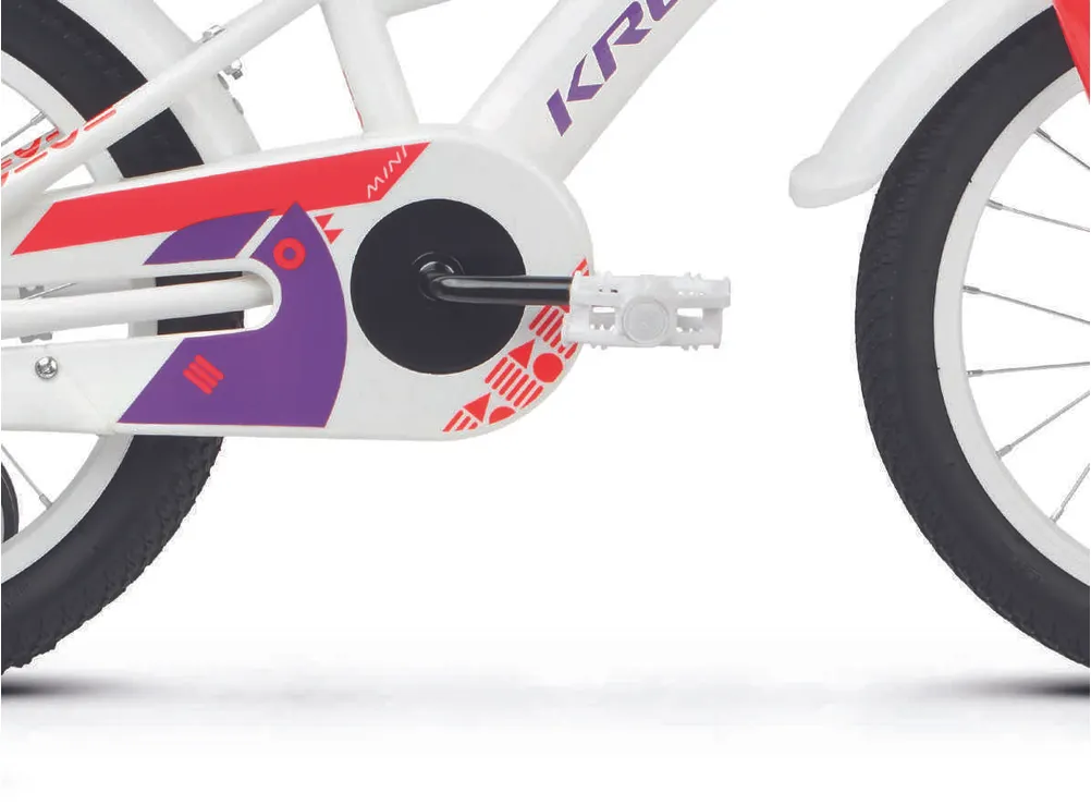 Ställ en fråga om Kross Mini 3.0 16" oväxlad vit/röd/violettJuniormodellen Kross Mini 3.0 är en tuff 16-tummare som aldrig backar för nya utmaningar. Helt perfekt för mindre juniorer som vill kunna utvecklas och vägrar låta materialet sätta gränserna. En robust och välutrustad modell med praktiska stödhjul (som givetvis kan monteras bort) som passar perfekt för blivande fartfantomer som älskar när det händer prylar.
