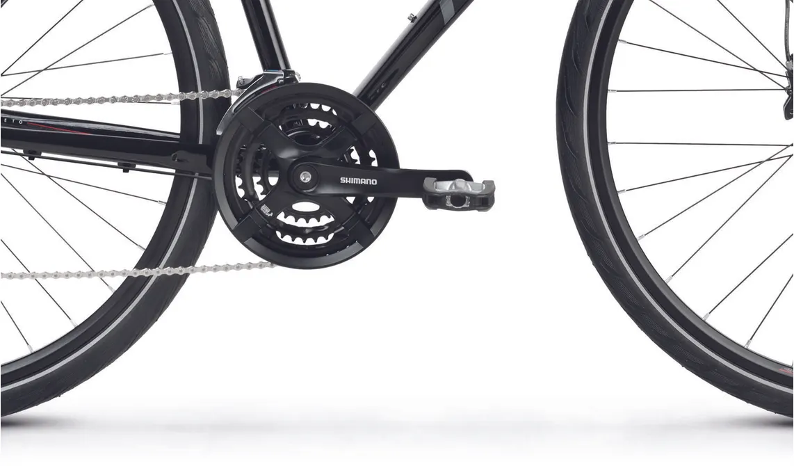 Under motorhuven sitter en funktionell 24-växlad drivlina från Shimano (Altus/Acera) som kommer se till att du enkelt tar dig uppför även riktigt tuffa uppförsbackar och som du enkelt hanterar med dom lättmanövrerade reglagen. Lite bredare däck från Schwalbe (40 mm) med slimmad profil ser till att du snabbt tar dig fram med full bekvämlighet, vilket självklart bidrar till en tryggare upplevelse i sadeln även där underlaget kanske sett sina bästa dagar.