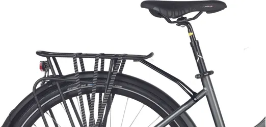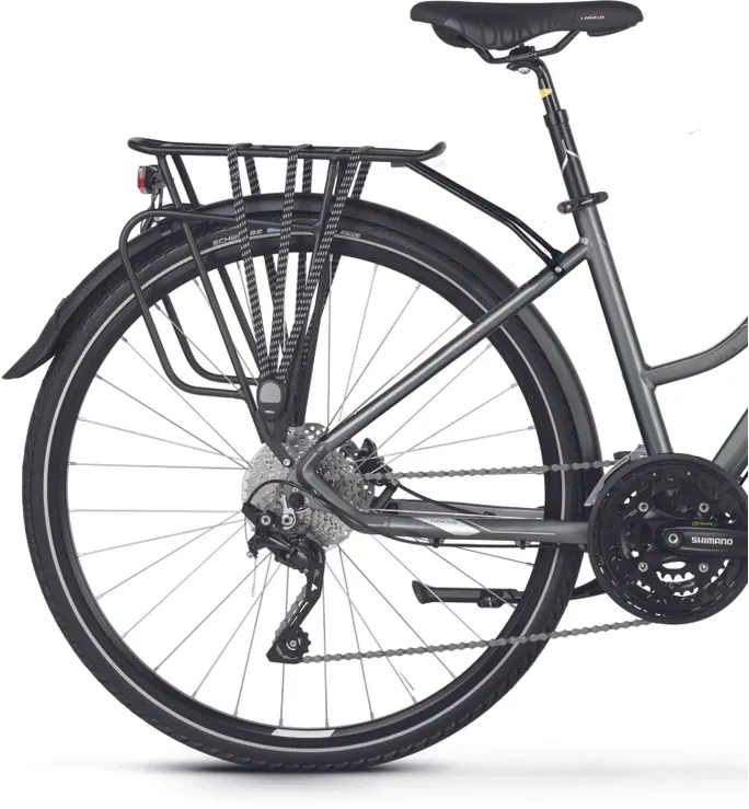En dämpade framgaffel från Suntour (NCX-D LO) med 63 mm slaglängd och lockout (gaffeln är låsbar) samt en dämpad sadelstolpe kombinerat med robusta hjul med lite bredare däck (42 mm) ser till att du tar dig fram med full bekvämlighet även där underlaget sett sina bästa dagar, vilket bidrar till en tryggare upplevelse i sadeln. Den är dessutom redan från start utrustad med både skärmar, pakethållare, belysning och stöd, vilket ju är praktiska kompisar i vårt skandinaviska klimat med både ur och skur.