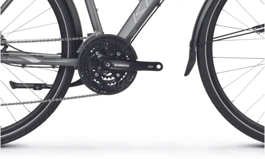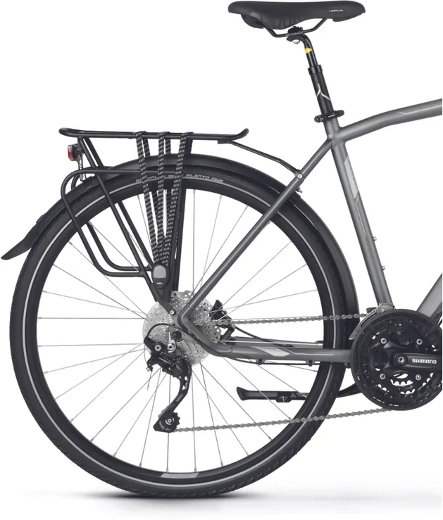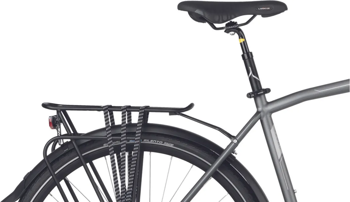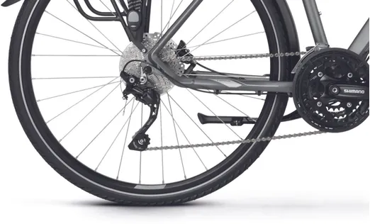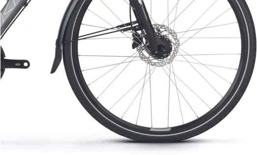 En dämpade framgaffel från Suntour (NCX-D LO) med 63 mm slaglängd och lockout (gaffeln är låsbar) samt en dämpad sadelstolpe kombinerat med robusta hjul med lite bredare däck (42 mm) ser till att du tar dig fram med full bekvämlighet även där underlaget sett sina bästa dagar, vilket bidrar till en tryggare upplevelse i sadeln. Den är dessutom redan från start utrustad med både skärmar, pakethållare, belysning och stöd, vilket ju är praktiska kompisar i vårt skandinaviska klimat med både ur och skur.
