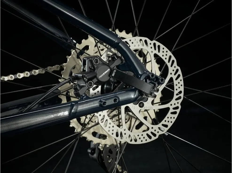 Den beprövade drivlinan består av en singelklinga (30T) samt en 10-delad kassett (11-46T) med växelförare som är hämtad från kvalitetssäkra Shimano (Deore), vilket sammantaget ger ett växelomfång som ser till att du kan hålla ett jämnt tempo oavsett vilken lutning eller terräng som gäller för stunden. Inbromsningen handläggs av effektiva hydrauliska skivbromsar från Tektro vilket ser till att du har kraftfull bromsverkan oavsett om det är lerigt, regnigt eller slaskigt underlag som gäller för dagen.