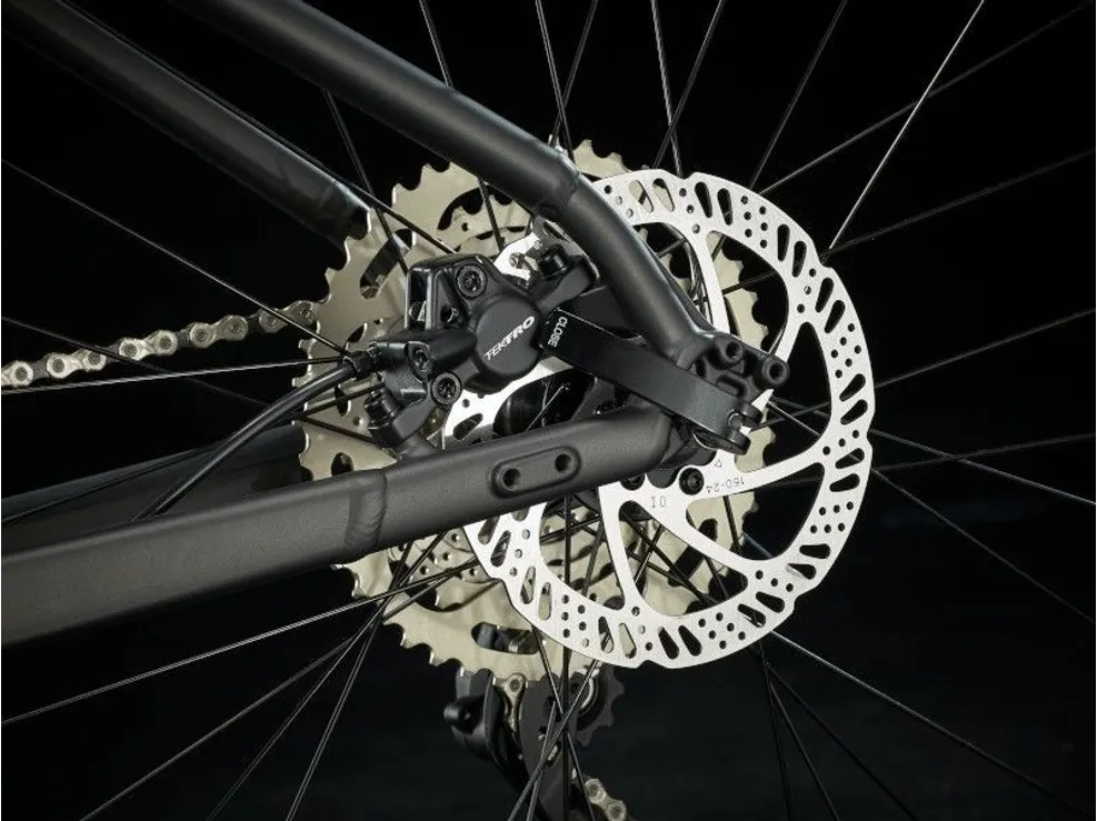 Den beprövade drivlinan består av en singelklinga (30T) samt en 10-delad kassett (11-46T) med växelförare som är hämtad från kvalitetssäkra Shimano (Deore), vilket sammantaget ger ett växelomfång som ser till att du kan hålla ett jämnt tempo oavsett vilken lutning eller terräng som gäller för stunden. Inbromsningen handläggs av effektiva hydrauliska skivbromsar från Tektro vilket ser till att du har kraftfull bromsverkan oavsett om det är lerigt, regnigt eller slaskigt underlag som gäller för dagen.
