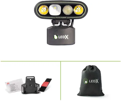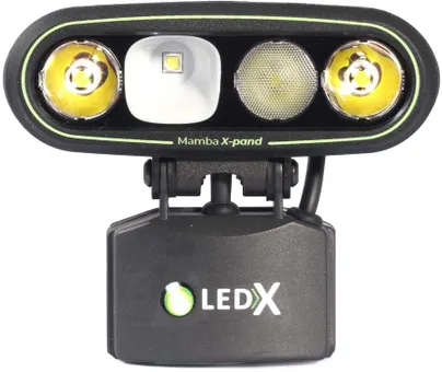 Kraftfulla Ledx Mamba 4 000 X-Pand + Lampfäste är en föredömligt kompakt pannlampa med låg vikt. Med sina 4 000 lumen ger den ungefär lika mycket ljus som de flesta billjus. Mamba har 4 st LED och en elektronik med imponerande hög verkningsgrad. Designen är unik med elektroniken integrerad i lampfästet och ett platt lamphus med stora kylflänsar som leder bort värmen effektivt. Lampan har en inbygd dynamisk temperaturreglering som håller temperaturen på rätt nivå, 75° C. När lampan används på de högsta effekterna måste den dock vara i rörelse för att prestera på max, normalt går det att använda lampan på 40% (50% av ljuset) även stillastående inomhus. Den platta designen med fästet rakt under lampan ger en välbalanserad och mycket lätt pannlampa. Resultatet är en lampa med en extremt bred men ändå lång ljusbild, upplevelsen är att du befinner sig i en stor bubbla av ljus, som når mycket långt. Det breda ljuset ger ett reflexfritt och vilsamt ljus för ögonen.