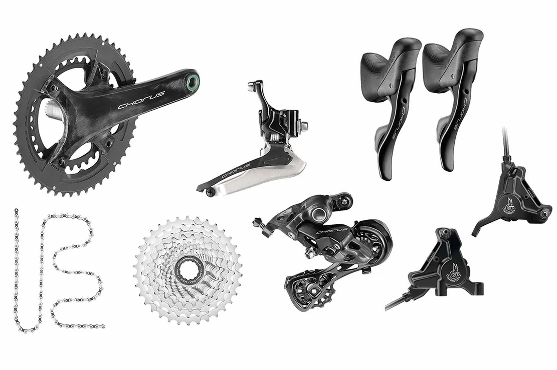 Under motorhuven sitter en ytters kompetent drivlina som plockats in från Campagnolo (Chorus), det handlar kortfattat om 24 växlar och smidiga reglage som väldigt sällan ställer till krångel. Italiensk design på högsta nivå utesluter såklart mediokra dussingrejor, och hjärtat i skapelsen är ett effektivt vevparti med dubbla framdrev (50-34T) som kombineras med en 12-delad kassett (11-32T) vilket ger en utväxling med imponerande bredd där fokus ligger på lite högre farter. Kassetten är dessutom föredömligt tätt stegad, vilket i praktiken ser till att du kan hålla exakt rätt kadens utan minsta problem.