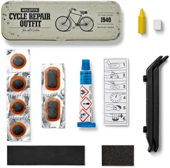 Ställ en fråga om Reparationskit Weldtite VintageWeldtite Vintage Repair Kit är en reperationsask i metal som har det du behöver för att laga en traditionell butylslang och innehåller;