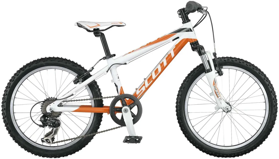 Ställ en fråga om Scott Contessa Scale Jr20 vit/orangeUnderbar barncykel, Inga problem för barnen att hänga med på turen - 6 växlat Shimano RD-TX35 GS med vridväxelreglage för små händer - Lätt aluminiumram med framgaffel SR Suntour XCT-JR som faktiskt fungerar. 10,50kg (Cyklistens längd 120-135cm).