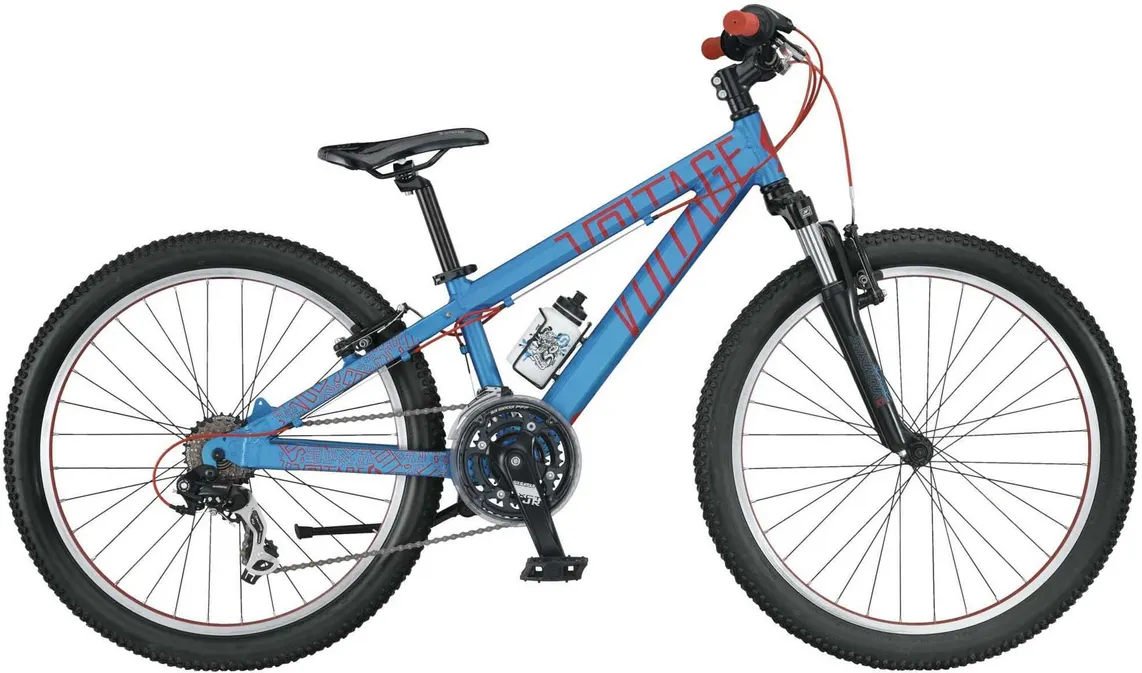 Ställ en fråga om Scott Voltage Jr24 blåCool dirt juniorcykel, byggd för att trixa runt på - 18 växlar med Shimano RD-TX35 GS och vridväxelreglage för små händer - Mjuk SR Suntour XCT-JR framgaffel som faktiskt fungerar. 13.10kg (Cyklistens längd 130-145cm).