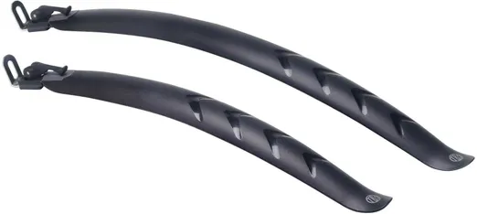 Skärmsats för landsvägscykel eller race hybrid med snabbkoppling. Fästet skruvas fast i ramen eller bakom bromsen. Två olika fästen medföljer till framgaffeln. Levereras separat parvis.