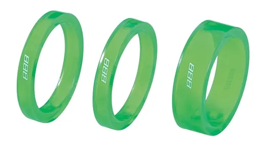 Ställ en fråga om Spacer BBB Transspace 1 1/8" grönFärgade distansringar till styrstam 1 1/8". - Tillverkade i transparent ultralättvikts kompositmaterial. - Set om 2 st 5 mm + 1 st 10 mm. - Färg: Grön.