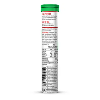 Innehåll: Acidity Regulators (Citric Acid, Malic Acid), Sodium Bicarbonate, Firming Agent (Sorbitols), Sodium Citrate, Potassium Citrate, Natural Flavourings, L-Ascorbic Acid (Vitamin C), Echinacea aerial part extract (Echincacea purpurea), Citrus bioflavonoids (Citrus sinensis), Orange Juice Concentrate, Leucine, Sweetener (Sucralose), Cholecalciferol (Vitamin D), Sodium Chloride, Folic Acid