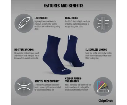 Ställ en fråga om GripGrab Lightweight SL Regular Cut Sommarstrumpor Navy BlueDen lätta GripGrab Lightweight SL är en snygg sommarsocka i klassisk längd. En välventilerad och bekväm strumpa i Coolmax, helt perfekt för cykling i lite varmare eller fuktiga förhållanden. Sömlös tåldel för maximal komfort kombineras med öppna meshzoner, vilket säkerställer en riktigt hög andningsförmåga och gör strumpan perfekt även för spinning eller andra typer av inomhusträning. Strumpan finns givetvis i massor av olika färger för att passa perfekt till ditt kit, stil och humör