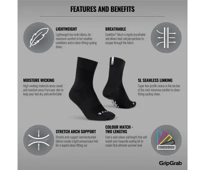 Ställ en fråga om GripGrab Lightweight SL Regular Cut Sommarstrumpor BlackDen lätta GripGrab Lightweight SL är en snygg sommarsocka i klassisk längd. En välventilerad och bekväm strumpa i Coolmax, helt perfekt för cykling i lite varmare eller fuktiga förhållanden. Sömlös tåldel för maximal komfort kombineras med öppna meshzoner, vilket säkerställer en riktigt hög andningsförmåga och gör strumpan perfekt även för spinning eller andra typer av inomhusträning. Strumpan finns givetvis i massor av olika färger för att passa perfekt till ditt kit, stil och humör